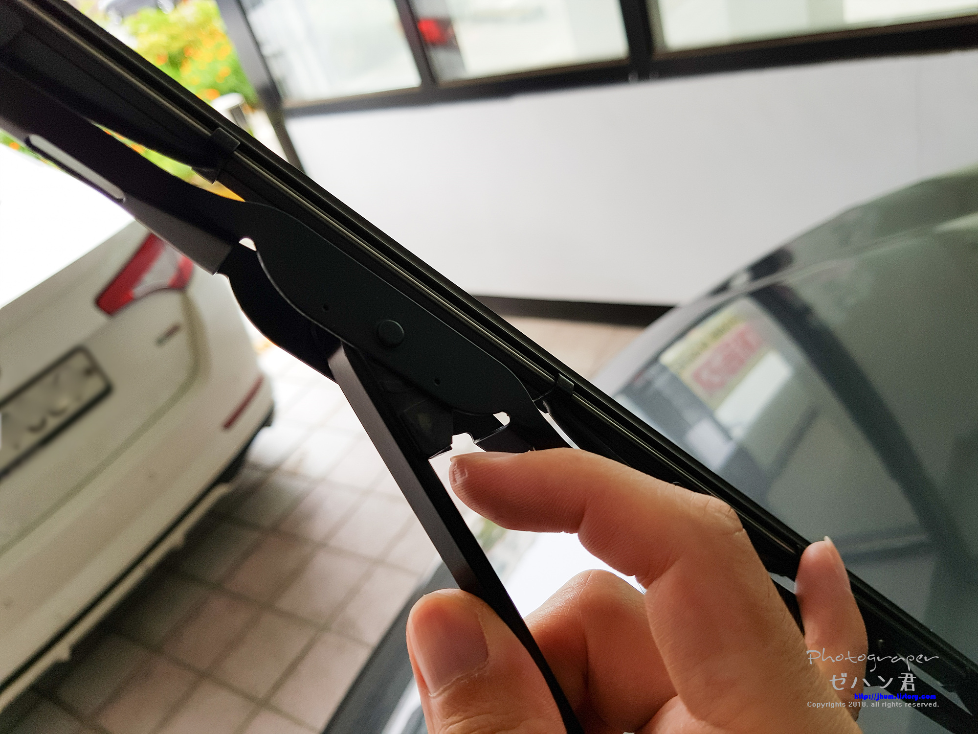 기존 와이퍼 탈거 방법은 손가락 부분의 스위치를 눌러주면서 몸쪽으로 와이퍼를 당기면 됩니다.
