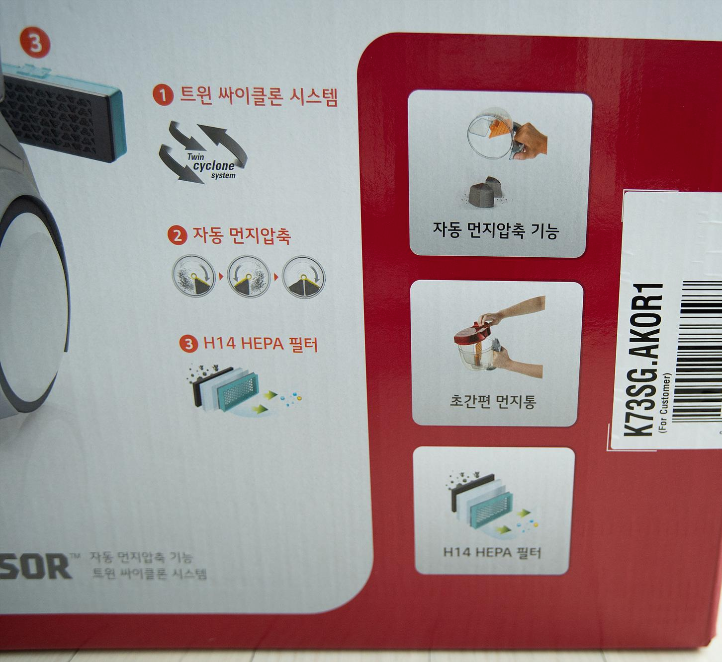주요 기능은 먼지 압축, 쉬운 먼지통 관리, 미세먼지 Zero