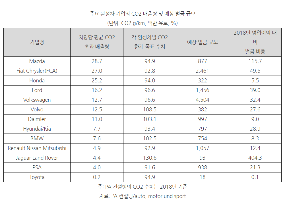 또한 EU는 2050년 '탄소배출 제로'라는 큰 목표로 올해부터 가입국 자동차 판매 기업을 대상으로 판매 차량의 CO2 배출량이 95g/㎞를 넘으면 1g/㎞당 95유로(약 13만원)의 과징금을 내도록 하고 있다.