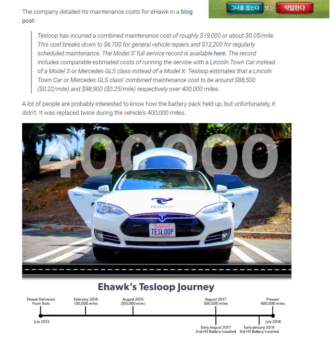 해당 차량은 Tesloop이라는 차량 공유 서비스로 혹사 당한 차량이며, 30만Km까지 배터리 열화율은 6%정도로 괜찮은 수준이었지만 공유차량의 특성상 잦은 과충전으로 배터리를 교체 했다고 하며, 그외 유지 비용은 대부분이 타이어 교체 비용이었다고 합니다.