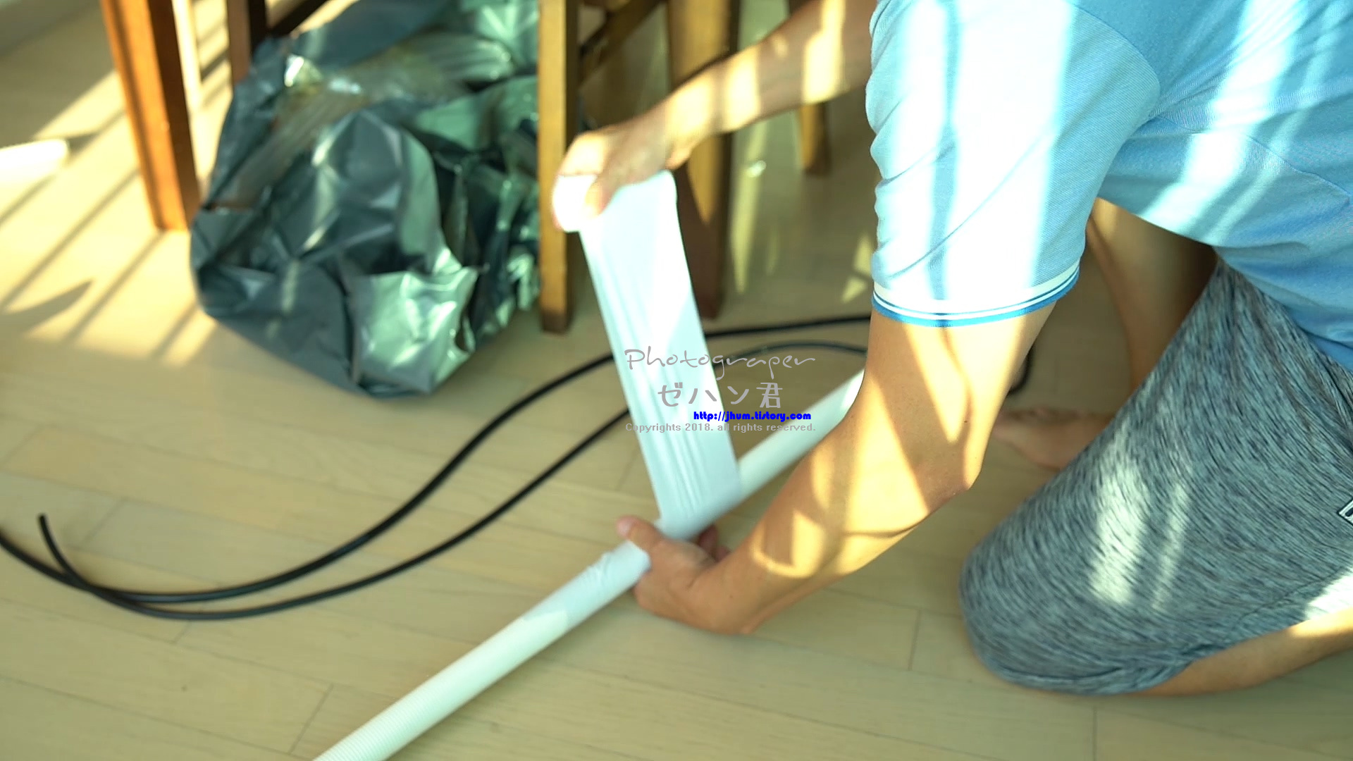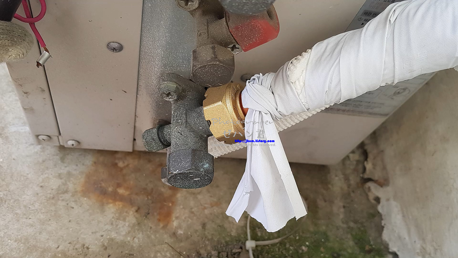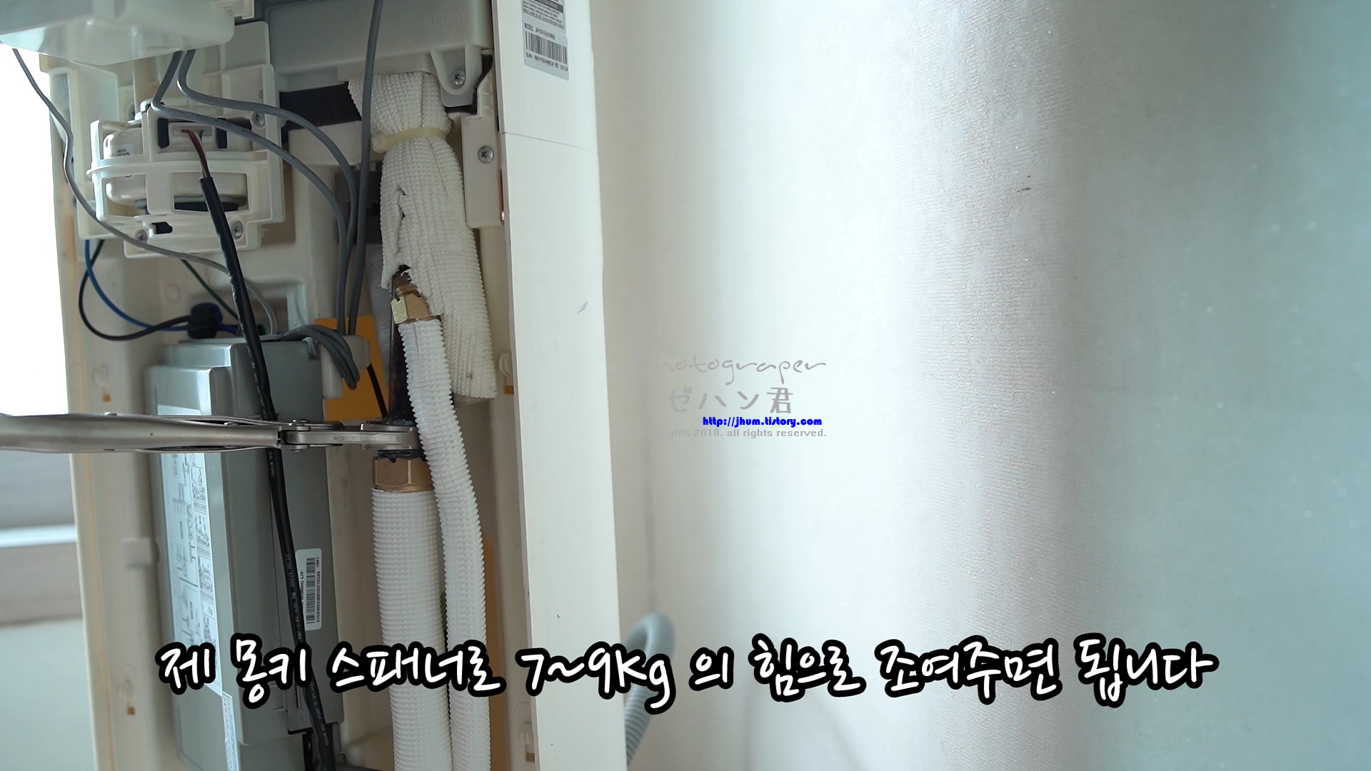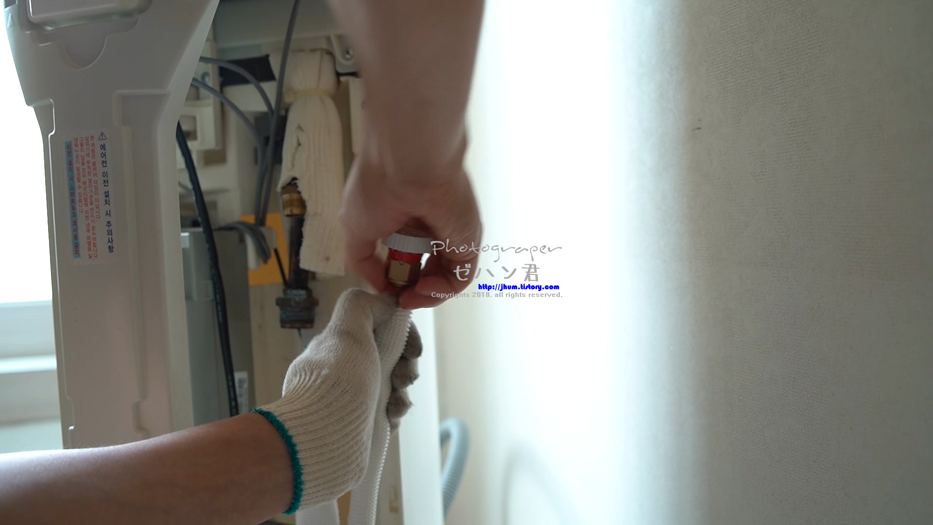 배관에 냉동테잎을 감아주는데 50%씩 겹치게 감아주시면 됩니다.