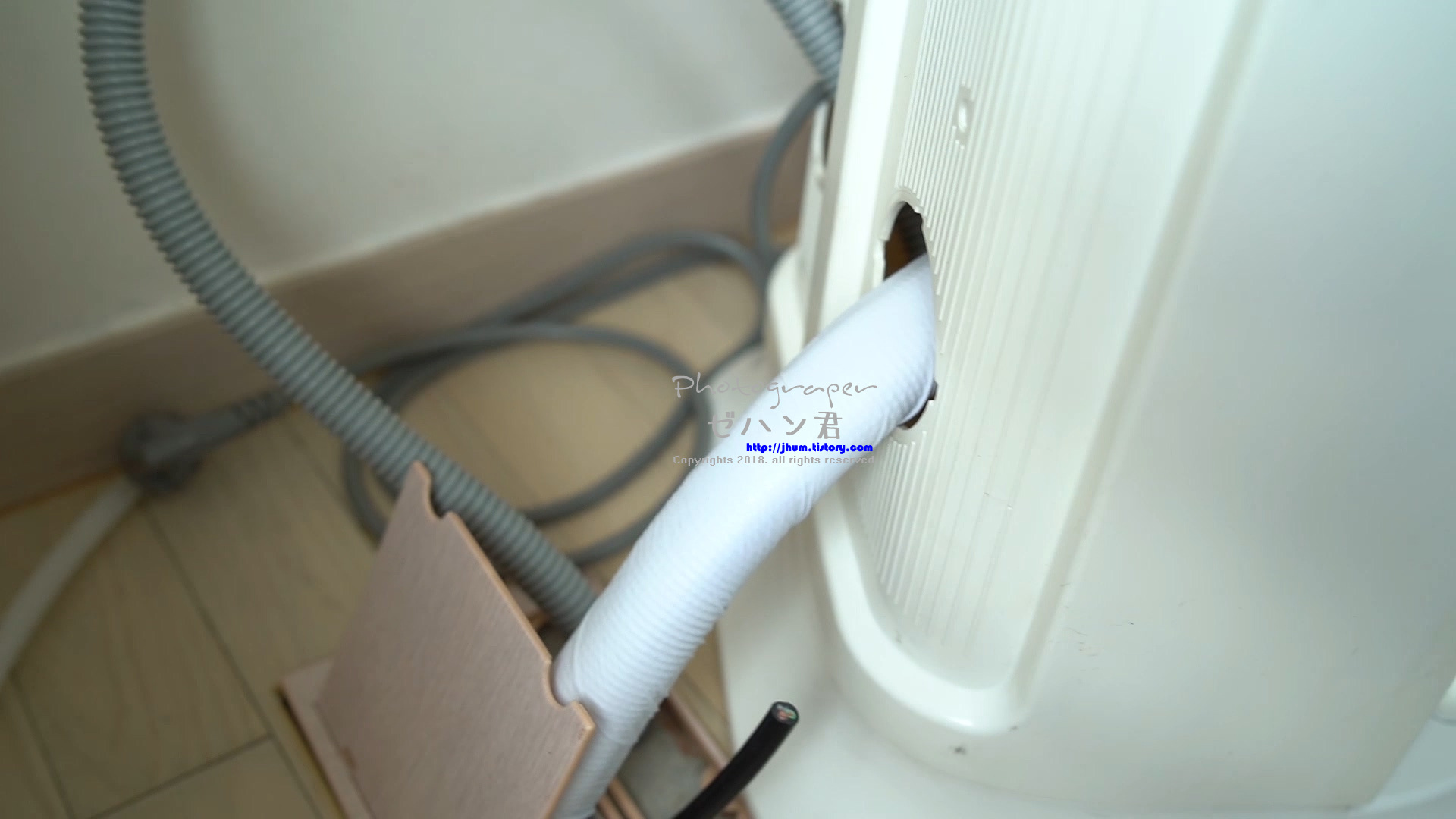 제가 사는 아파트는 바닥에 에어컨 배관 구멍이 있어서 그쪽으로 넣어주었습니다.