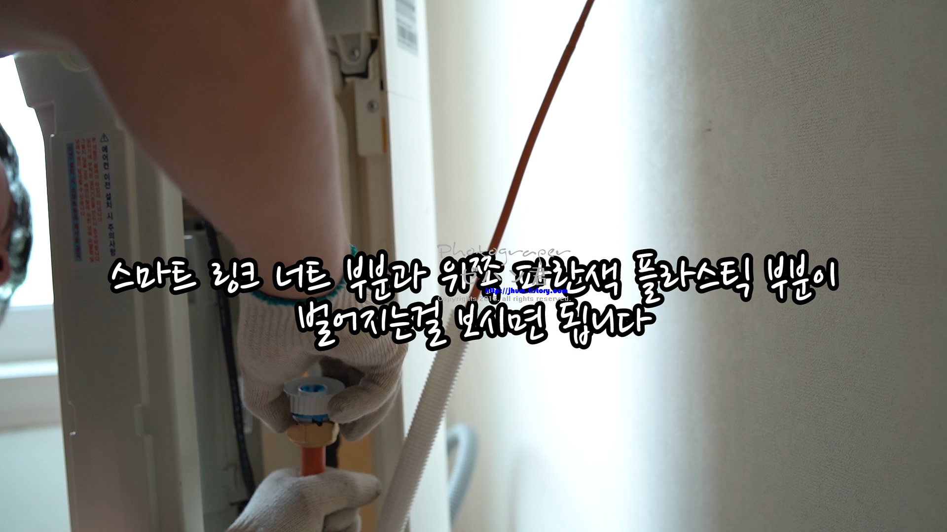 스마트 링크는 배관에 꾹 눌러서 다음의 사진과 같이 너트와 위쪽 플라스틱이 벌어질때까지 눌러서 끼워주세요.