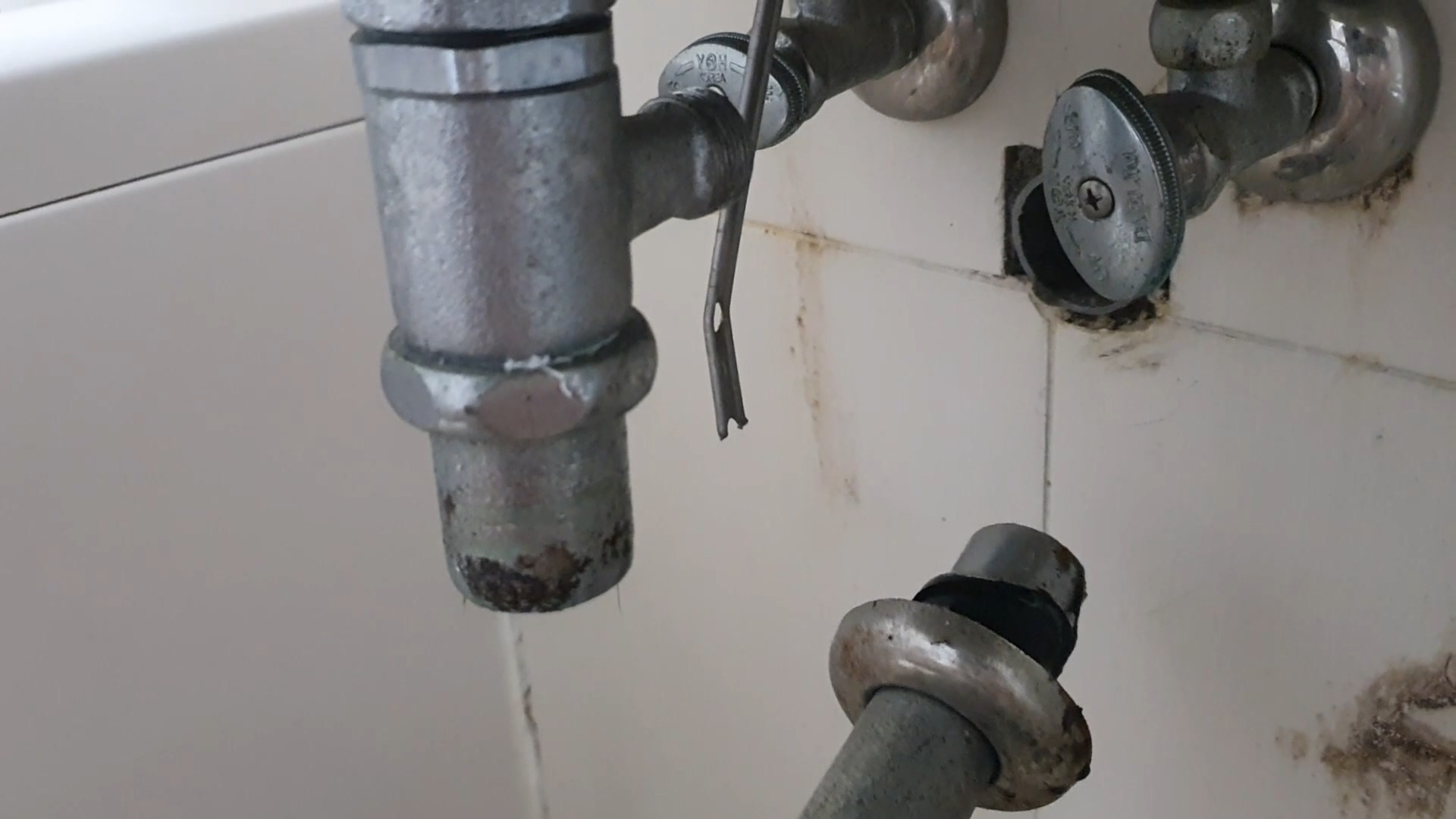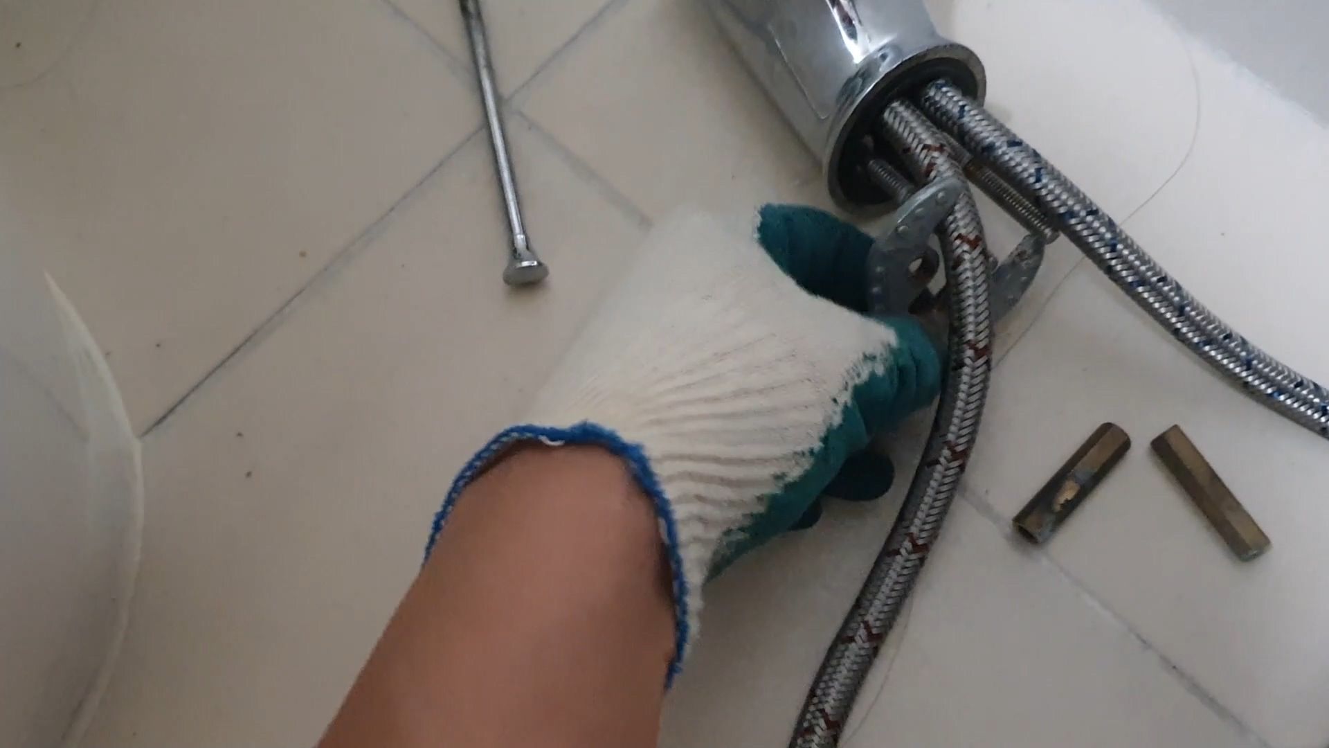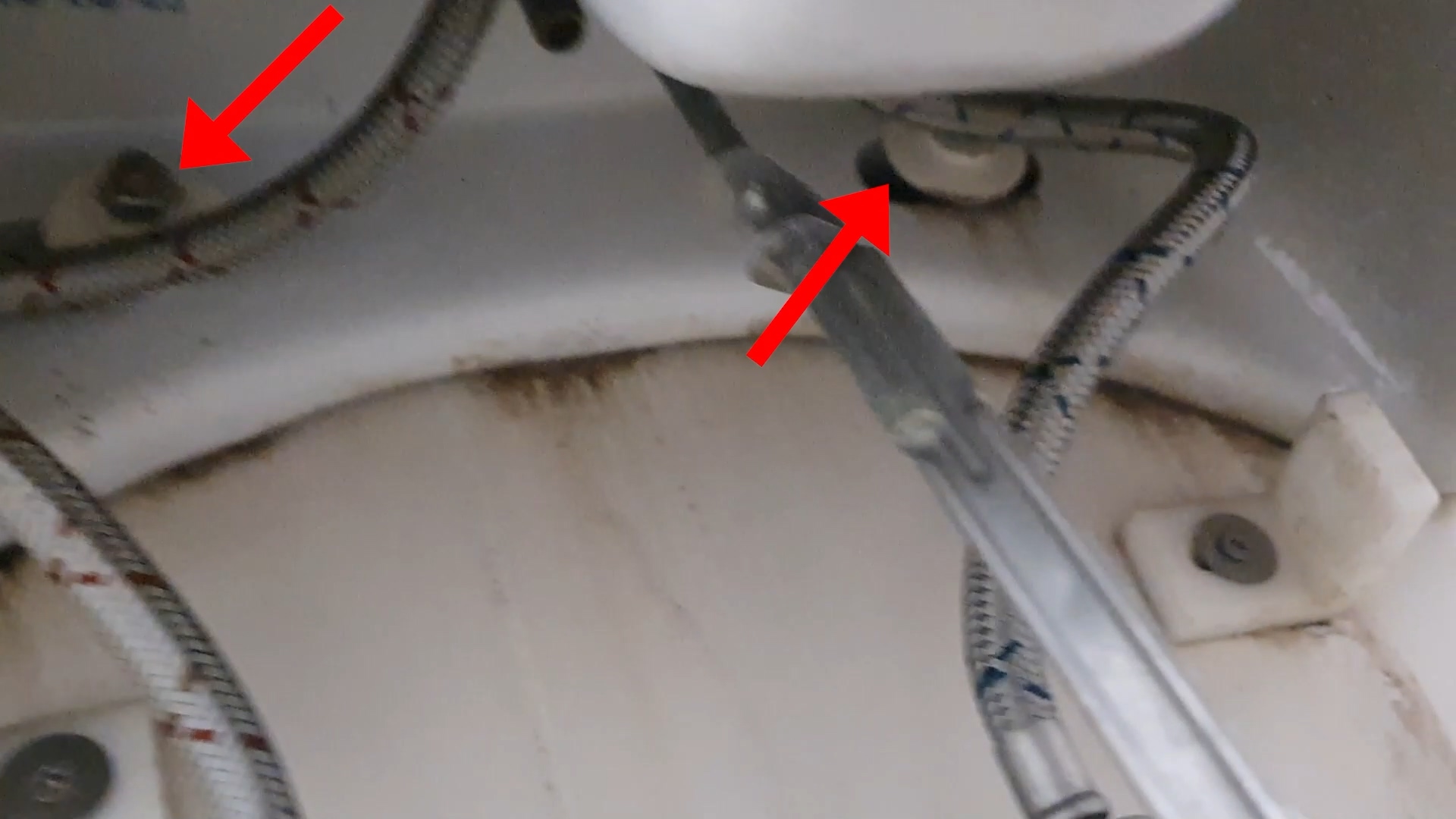 수전도 방식이 다양한데 이 수전은 말발굽 같이 되어 있는 저부분이 아래 긴 육각 나사에 의해 체결되어 있는 구조에요.